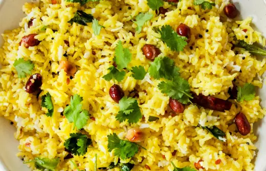 Lemon rice with mustard seeds, peanuts, and turmeric.