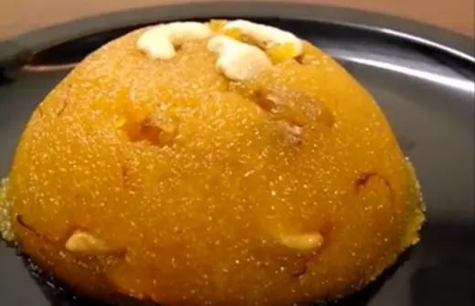 Sweet semolina flavored with saffron and cashews.