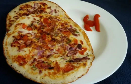 Thick pancake with vegetables like tomatoes, onions, and chilies.