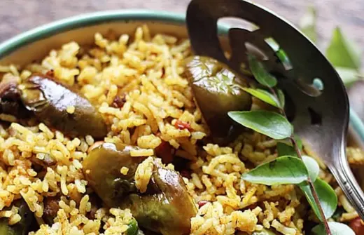 Rice with eggplant, spices, and tamarind, served with raita.